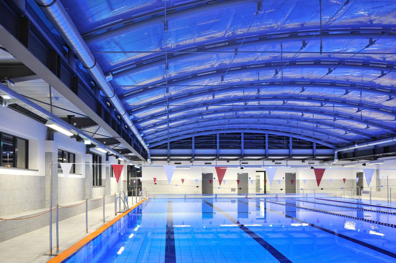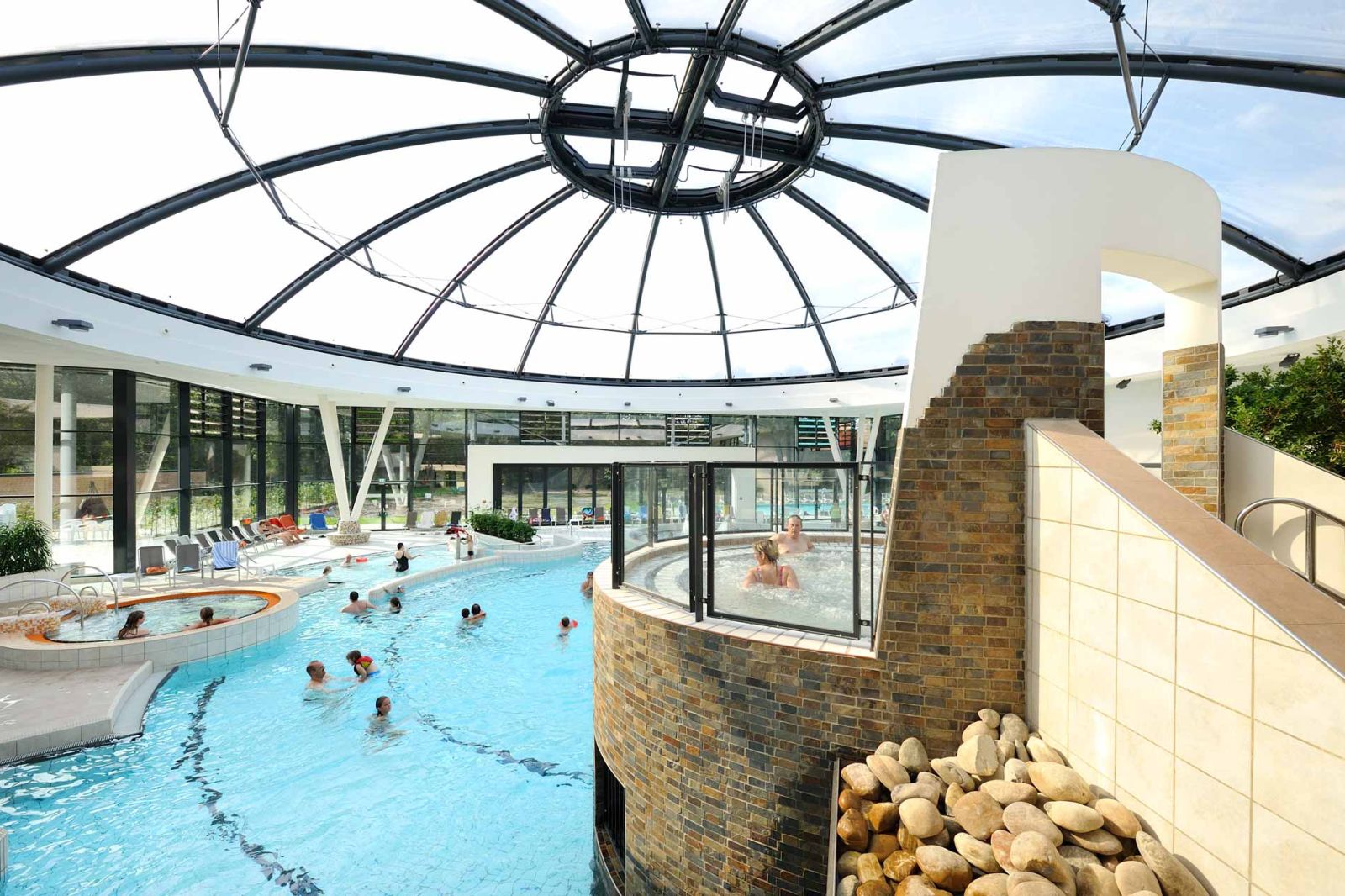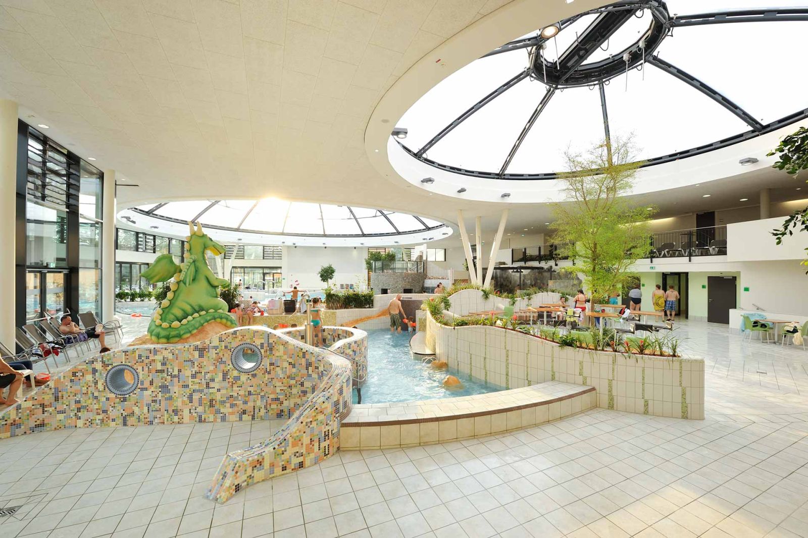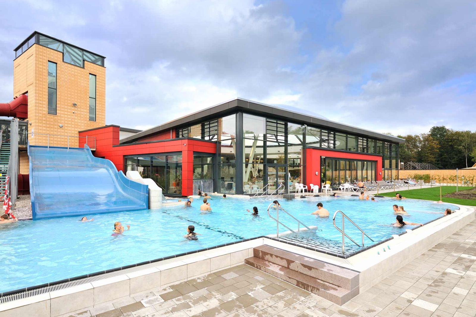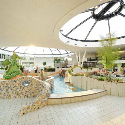 Die neue Freizeitanlage ist auf die Bedürfnisse breitgefächerter Bevölkerungsgruppen zugeschnitten. Die Anlage ermöglicht den Vereins- und Schulsport, bietet ein Freizeit- und Erlebnisbad mit attraktiven Spiel- und Aufenthaltsflächen. Großzügige öffenbare Fassaden ermöglichen einen fließenden Übergang zwischen dem Innenbereich und dem Außenraum. Weitgespannte Foliendächer geben den Blick in den Himmel frei. Die Rutschenanlage mit Black-Hole-Röhrenrutsche (76 m Länge) und das Außenwarmlandebecken runden das Badeprogramm ab.